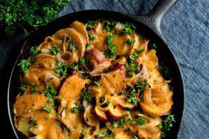 Layer potatoes in your dish. Evenly distribute sauteed onions over the layered potatoes.