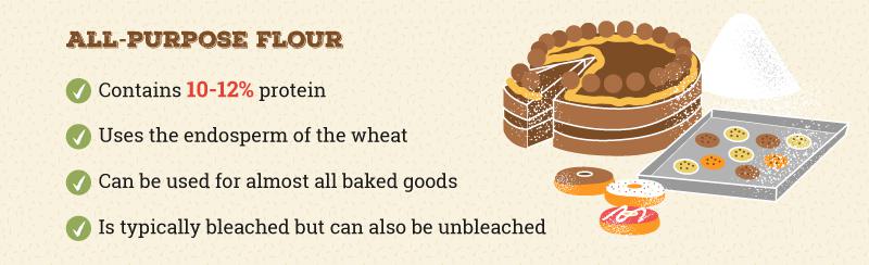 All purpose flour is made by separating the three parts of the wheatthe bran, the germ, and the endospermand only grinding the endosperm. Its typically milled from high and low protein wheat, which makes it flexible enough for almost any baking purposeit is sturdy enough to support different types of bread, but not too strong for a tender cookie or brownie. This flour is typically bleached, but you can also purchase the unbleached version as well. We recommend always having a bag of all purpose flour in the pantry for your everyday baking needs!