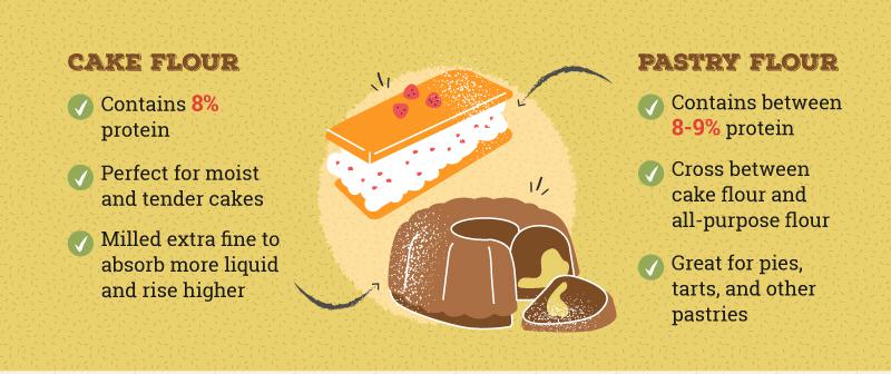 At 5-8% protein, cake flour has the lowest protein content and is perfect for creating flaky cakes. Cake flour is milled to an extra-fine consistency, which helps it absorb more water and rise higher, as you want a cake to do. Your cakes will be extra tender if you use cake flour!