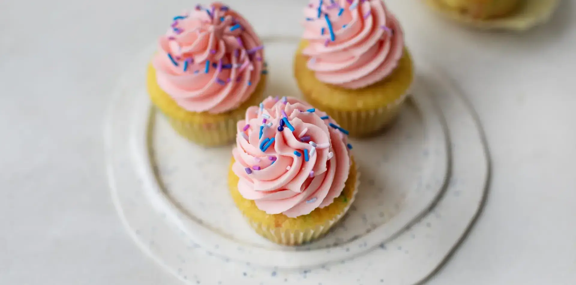 A party in a cupcake! Soft, yellow cupcakes dotted with rainbow sprinkles, topped with fluffy pink buttercream and even more sprinkles … because, why not?