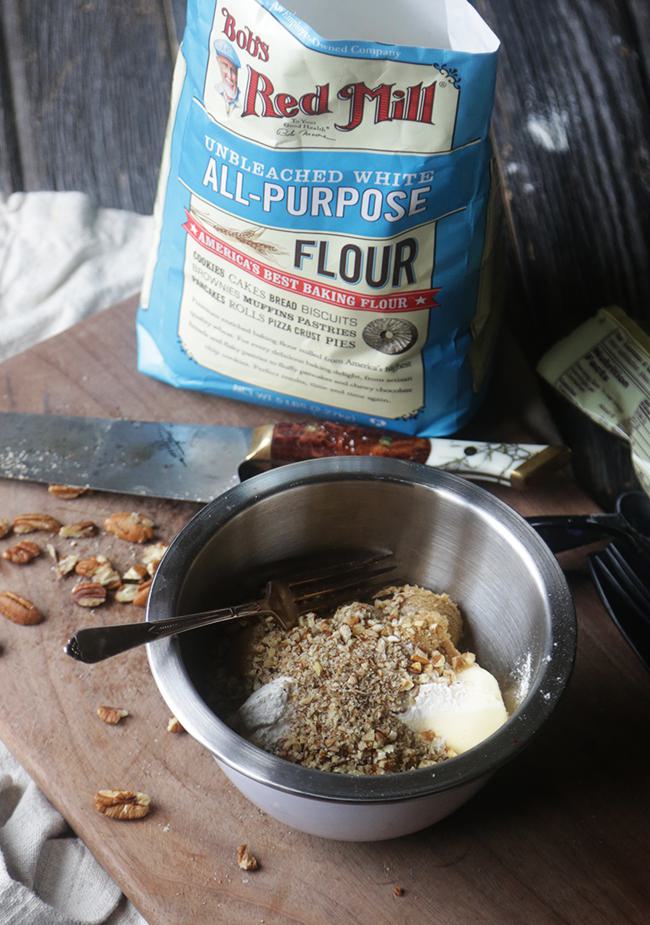 The next best part of the coffee cake is the center. Now there are a ton of different things you can do here, like brown sugar and butter chunks, or fruit, or icing, but I decided to have the best of all things and mixed together some softened cream cheese and half of the pecan streusel. Thats right: cream cheese, butter, brown sugar, cinnamon, and pecans as my center. Can you blame me?