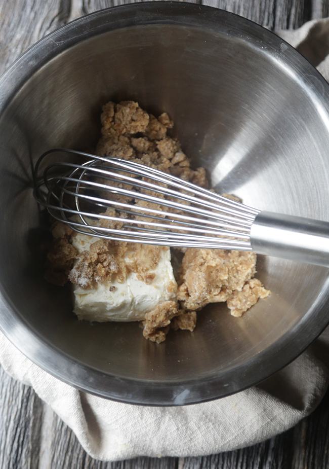 For the filling: Add the cream cheese and half of the streusel to a medium size bowl and whisk until completely combined, and set aside.