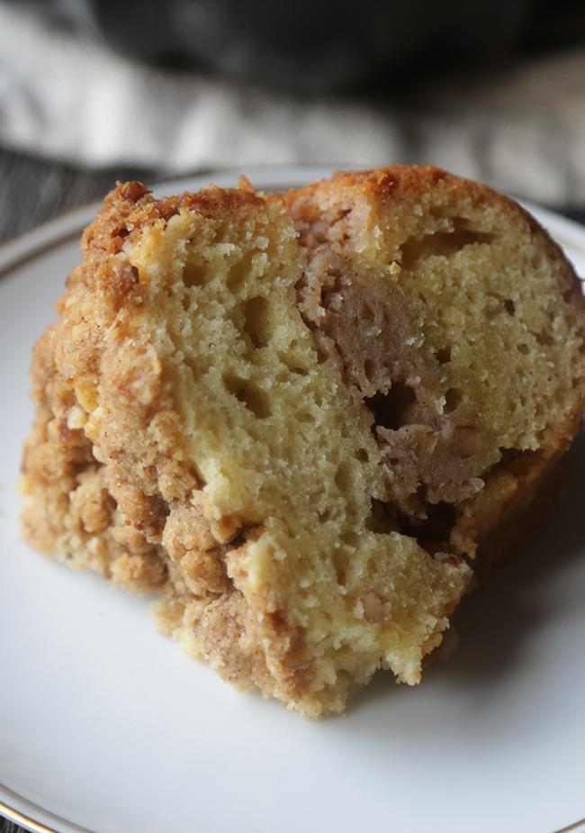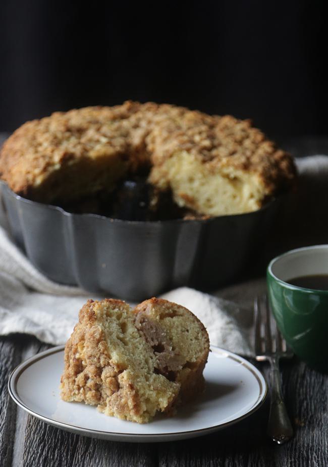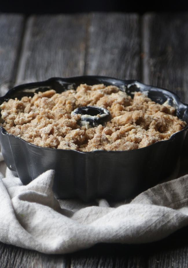 Time to load up your Bundt pan with all this delicious goodness. Start by adding half of the batter to the bottom and then layering on the cream cheese filling, the other half of the batter, and then the crumb topping. From there you bake in the oven at 350F for about 45 minutes. I always say that simplicity is elegant when it comes to food, and thats why the classic coffee cake is still so dang good. Enjoy!