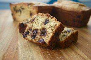 In a large mixing bowl, combine the flour, sugar, protein powder, baking soda, and baking powder. Next add the milk, egg, banana, and apple cider vinegar to the flour mixture and whisk just until blended. Fold in the chocolate chips and evenly distribute the batter between the prepared pans. Sprinkle with a little extra sugar and bake for 40 minutes, or until a toothpick inserted in the center comes out clean. Allow to cool in the pan for 10 minutes and then remove from the pan to cool completely.