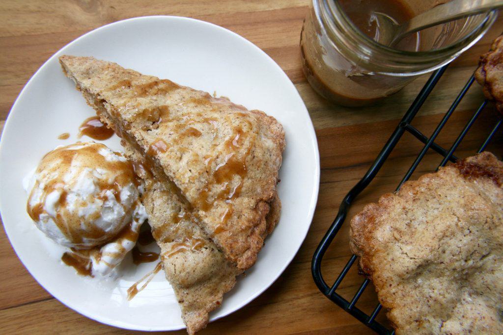 Bake 25-30 minutes, until the edges are golden brown. Serve warm with remaining caramel sauce and vanilla ice cream, or at room temperature straight from your hand.