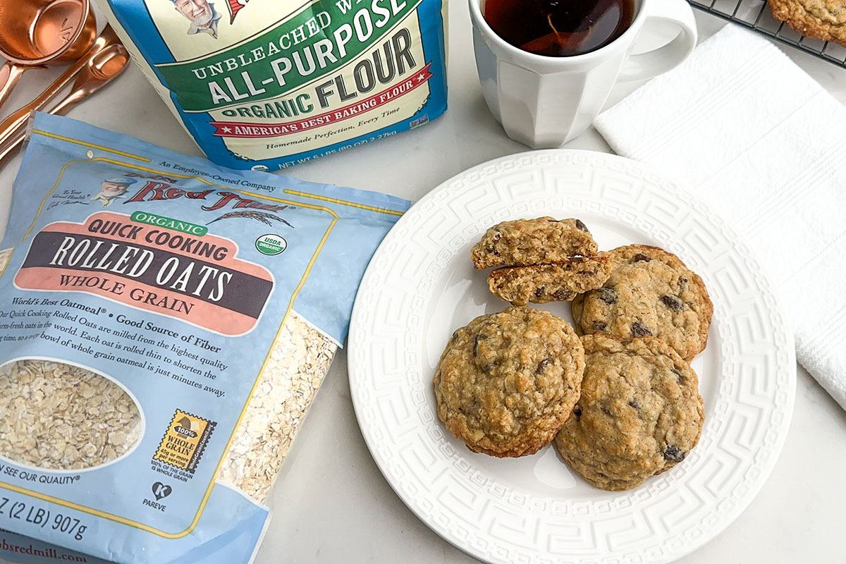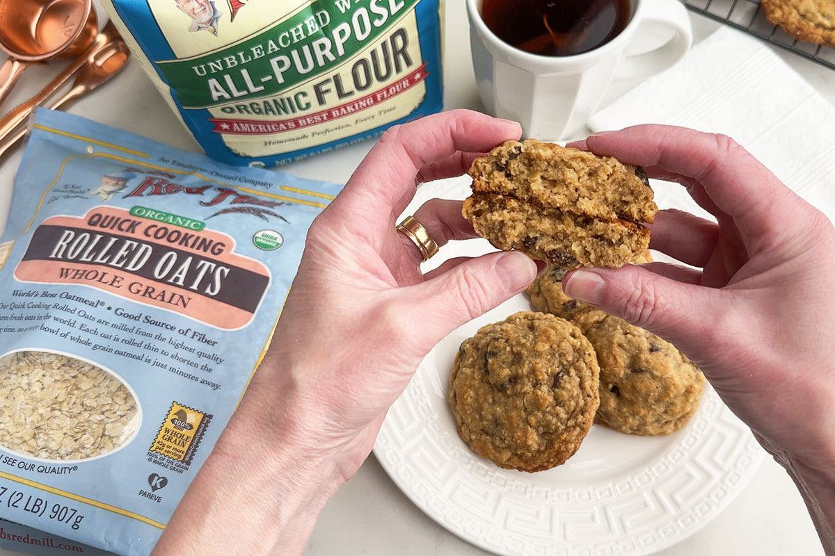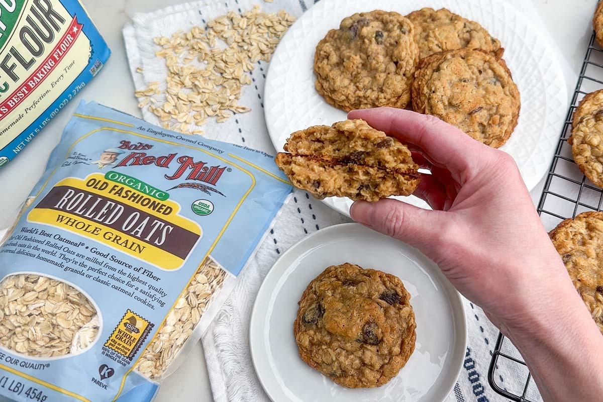 Because the flakes in oatmeal cookies with protein oats are thicker, these cookies spread the most and bake up thinner―but still soft and chewy―with crisp edges. The oat texture was hearty, and the flavor was deliciously nutty. Since the thicker oats absorb liquid a bit differently, the cookies were slightly more delicate and tender, though they held together nicely once cooled.