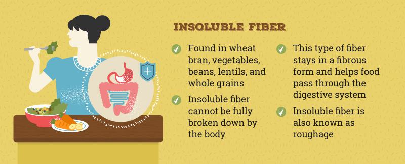 Insoluble fiber, on the other hand, is found in foods such as wheat bran, vegetables and whole grains. It helps food pass more quickly through the stomach and intestines. Unlike soluble fiber, insoluble fiber does not dissolve in water.