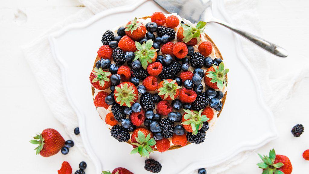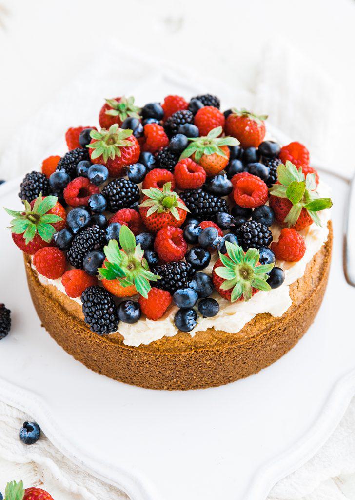 To finish this cake off, spread on the buttercream and top it off with fresh berries! DELICIOUS!