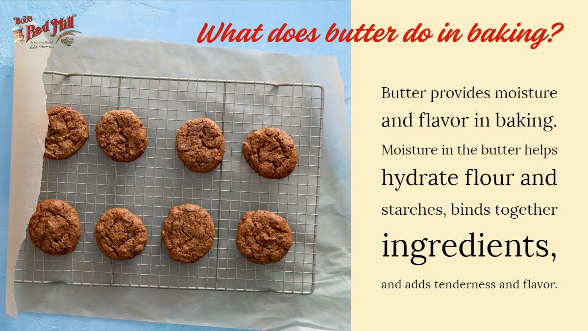 Butter provides moisture and flavor in baking. Moisture in the butter helps hydrate flour and starches, binds together ingredients, and adds tenderness and flavor.