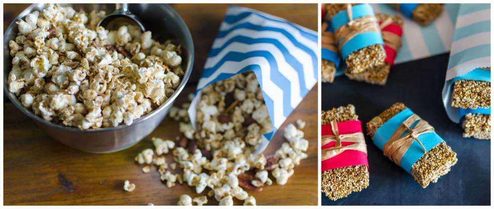 Mix together popped Yellow Popcorn, toasted pecans, pumpkin seeds, flaxseed, coconut, and a little melted coconut oil and maple syrup. Toast it all together in the oven to marry the flavors. Pass around a big bag in the car or portion into individual snack bags.
