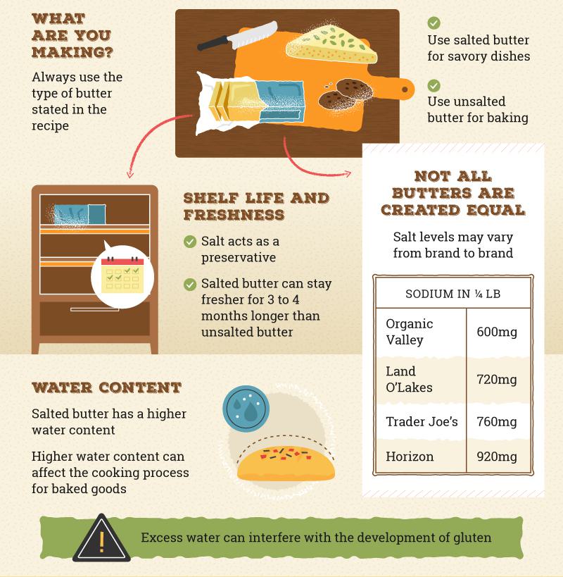 (All of these values are per stick of butter.) You could change a recipe without meaning to if you use a different brand of butter than you have previously. For this reason, in baking it is important to use unsalted butter if it is called for in the recipe, so you can add the right amount of salt to your recipe and avoid adding too much by accident. If you are a baker, then you will likely need to keep both types of butter around, but if you are simply cooking a lot, then you should be safe sticking with butter that has salt added. If you are out of unsalted butter, then feel free to use the salted kind, especially for recipes like cookies, but decrease the additional salt in the recipe to compensate for it, so you do not accidentally overdo it on the salt.