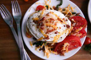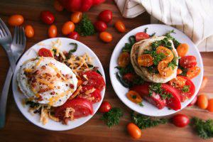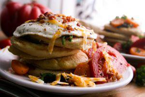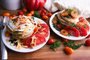 I did a his and hers version for this round of pancakes. My husband got the royal treatment of roasted poblano peppers, bacon, cheddar cheese, fresh farmer's market tomatoes, and an over easy egg on top.