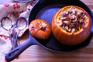 Don't throw out those Thanksgiving decorations too soon! Bake them! This Baked Apple Stuffed Pumpkin pretty much encompasses everything I love. Sweet crisp apples stuffed in a delicious pie pumpkin mixed with coconut, dried fruit, nuts, a little brown sugar and a scoop of vanilla ice cream. Pure heaven! Its kind of funny how this sweet little treat came to be. I wish I could take all the credit, but the reality is it was completely teamwork with my main squeeze. You see we recently signed up for a weekly produce shipment, which I love. I mean come onI get fresh seasonal produce delivered to my doorstep weekly! I like this on a couple of levels. One, it keeps our costs down from going to the store constantly where we inevitably will grab more than we need. Two, its seasonal food sourced locally which helps us eat the way we are supposed to during the season. Three, it forces us to get creative in the kitchen which makes cooking more fun! Case in point, this Baked Apple Stuffed Pumpkin was born. The best thing about this dish is that while it makes a deliciously sweet semi-indulgent dessert it would also make a perfect side dish at dinner (my boys say pork chops with this are a must) or it would be an amazing addition to your brunch table with a scoop of creamy cool vanilla yogurt. Perfect, right?! I love how well the flavors play together. The apple juices baked into the pumpkin, with that coconut goodness permeating throughout and the nuttinessmmmmm! Also, can we talk about how pretty the pumpkin is? I love the rustic beauty of the roasted pumpkin. I think you get the picture. I loved this dish and I hope you love it as much as we did.